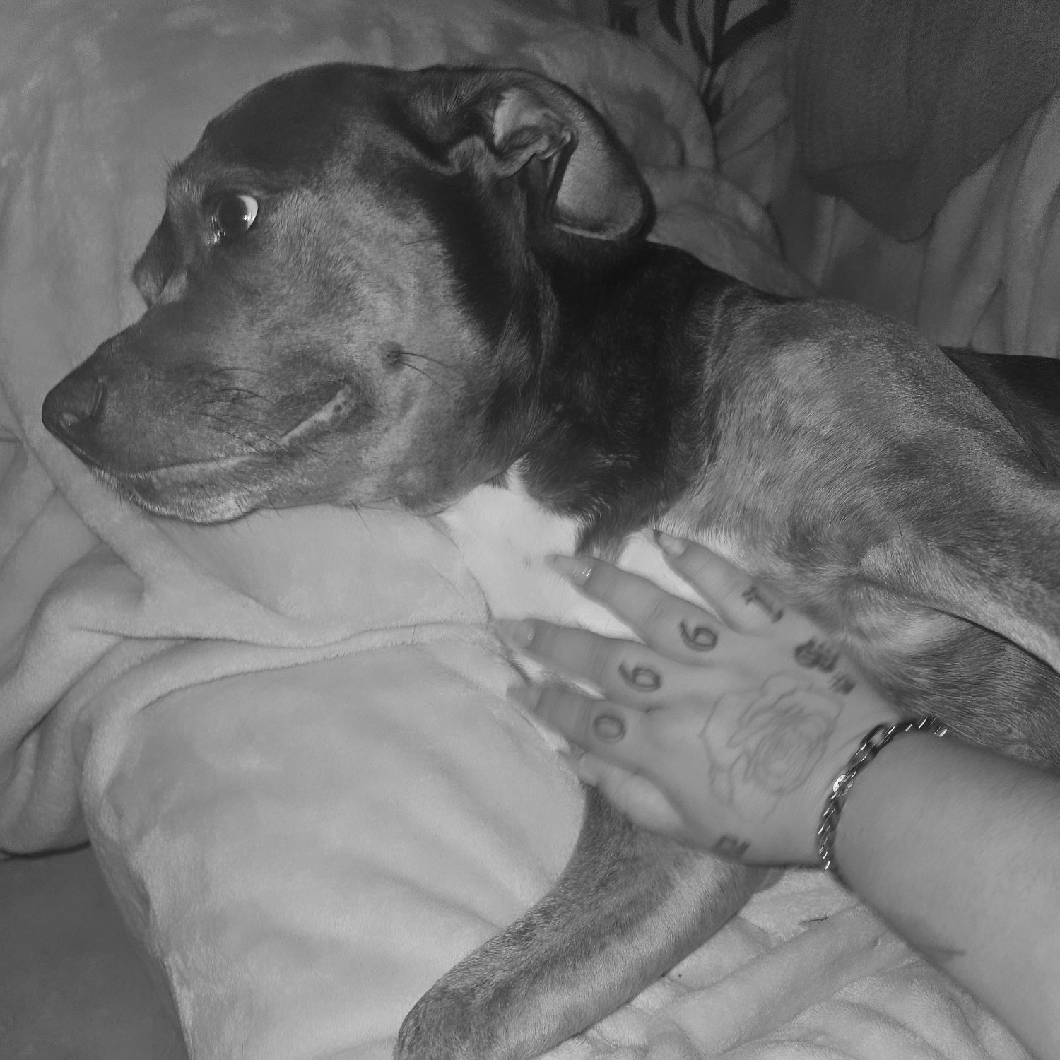 Small dogs love her. She's been hurt by men and women. I protect her. We have both grown alot together and come a long way. She loves to water and nature, but they stalk and try to kill us. So we can't go outside anymore. It's their fault. They owe us a house with a yard and a new car and everything.